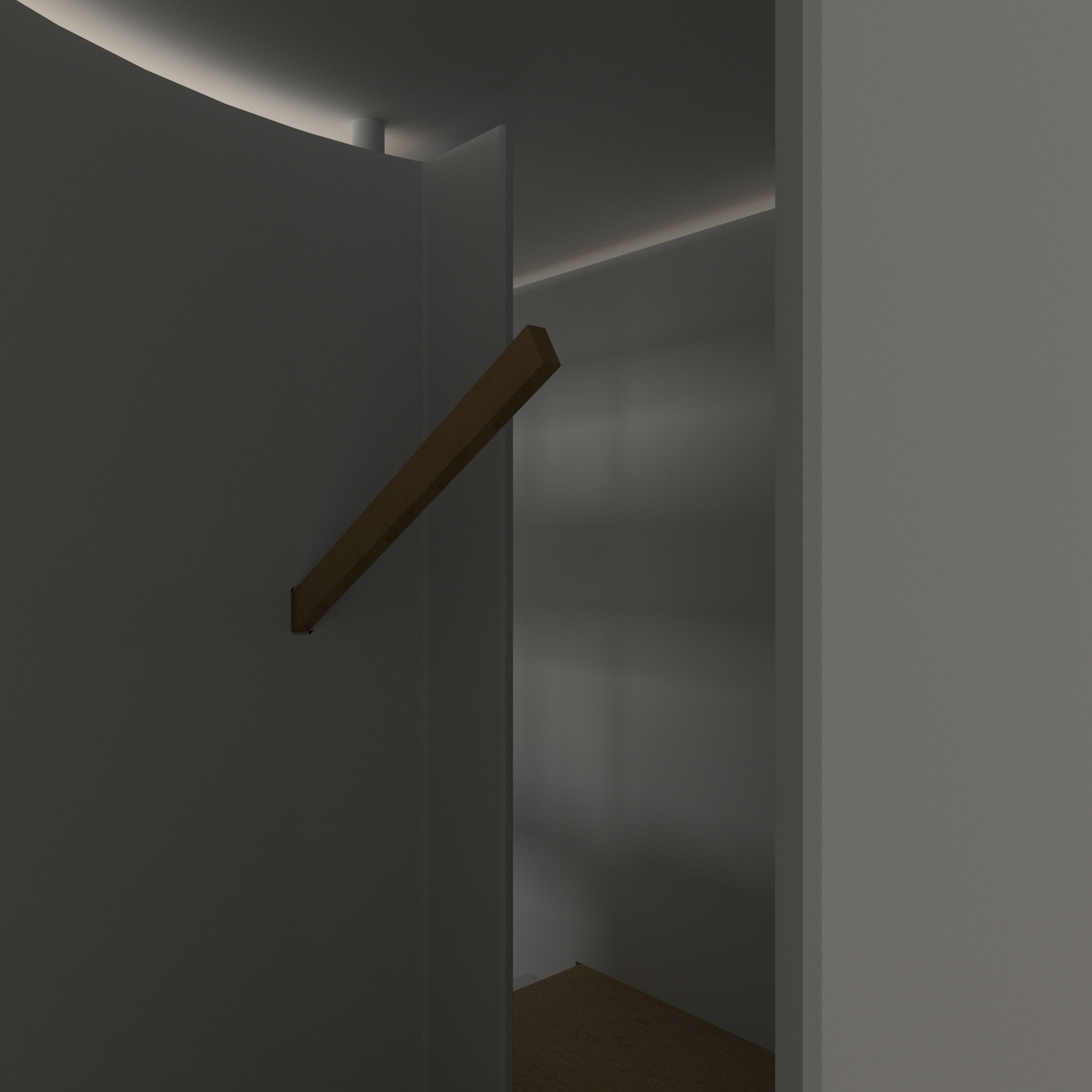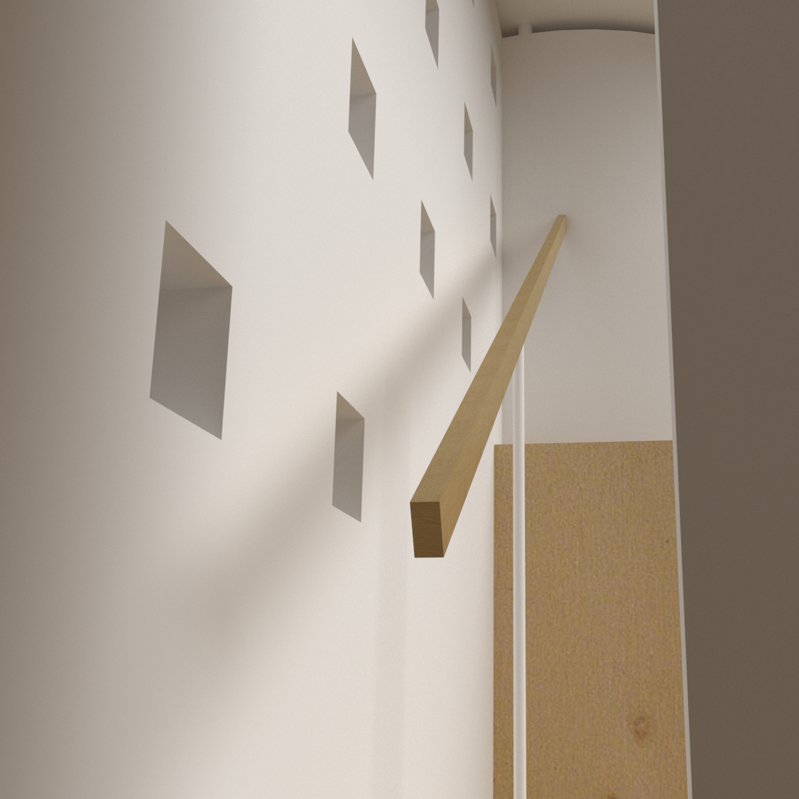This concept project began with a 20-foot long, two by four board. The owner wished for the board to be displayed with most of it viewed from the exterior, but still have a portion that can be observed from the interior of the structure.