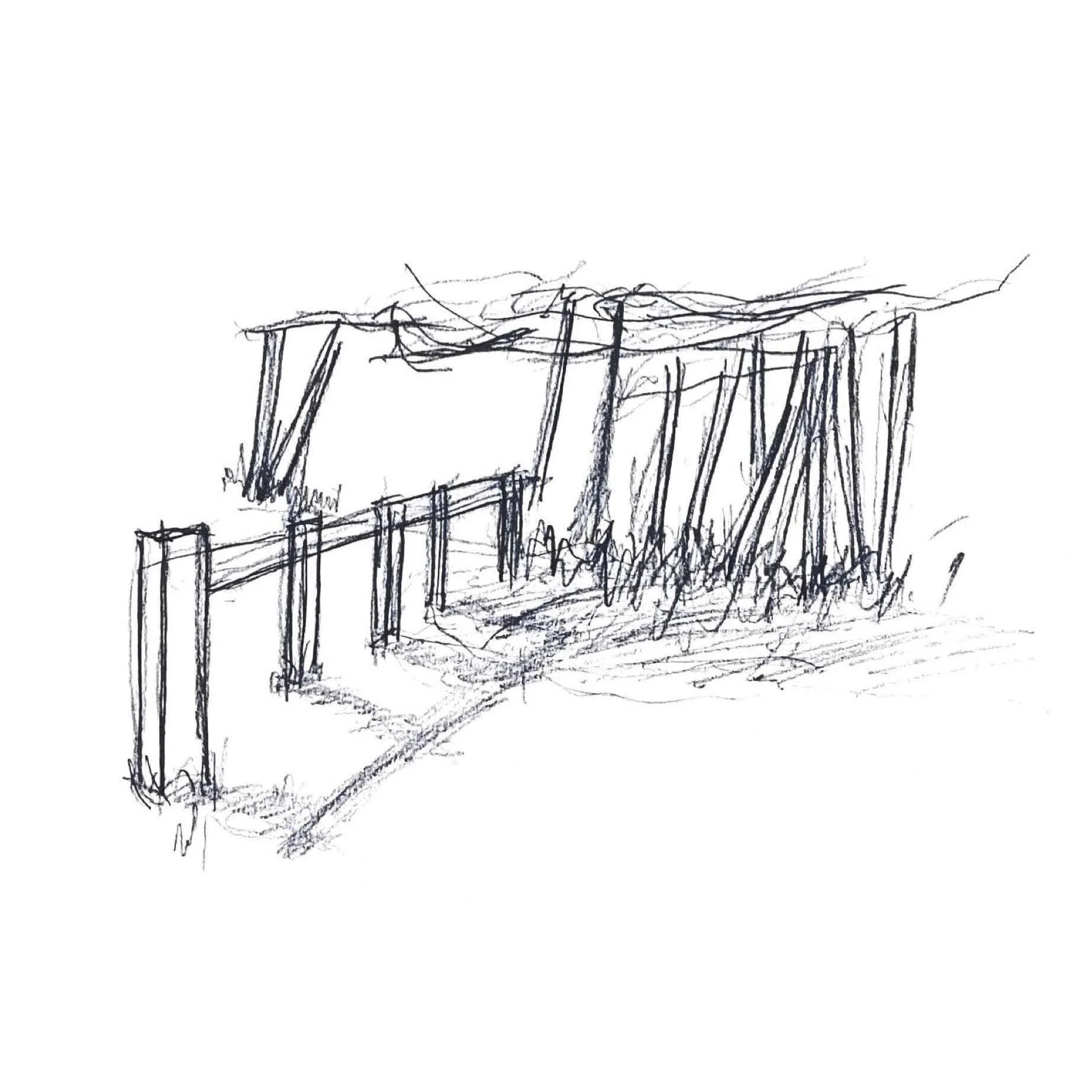 Sketch of a timeworn, wood post fence leading towards a group of trees.